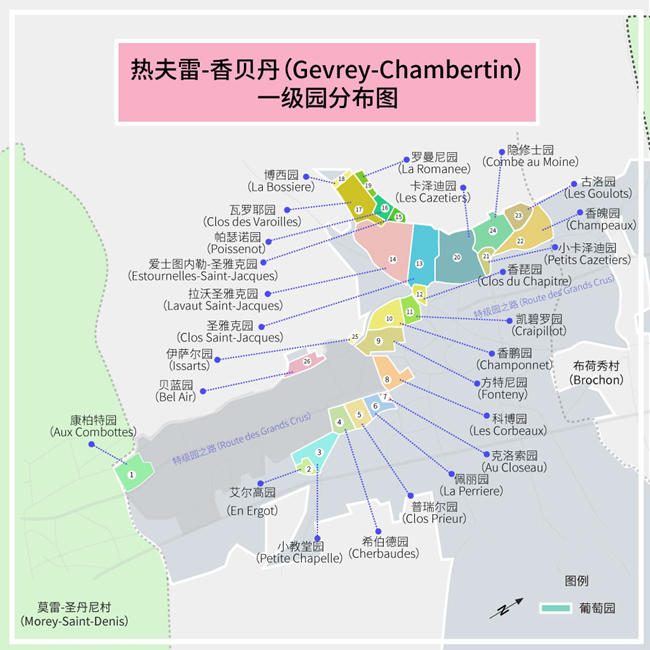 此外,勃艮第還有數(shù)個大大小小的村莊,不同村莊衍生出了不同的法定產區(qū),各個村莊獨特的風土也為這些村莊刻上不同標簽。比如,提到熱夫雷-香貝丹(Gevrey-Chambertin),就會讓人想到強勁、飽滿、豐富和堅實的結構,以及極強的陳年能力。提到香波-慕西尼(Chambolle-Musigny)就讓人想到優(yōu)雅與精致。