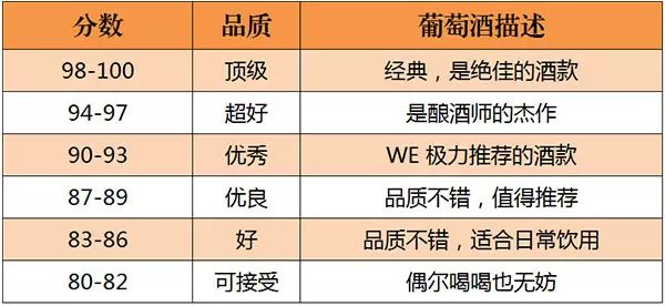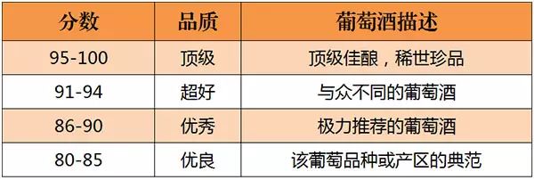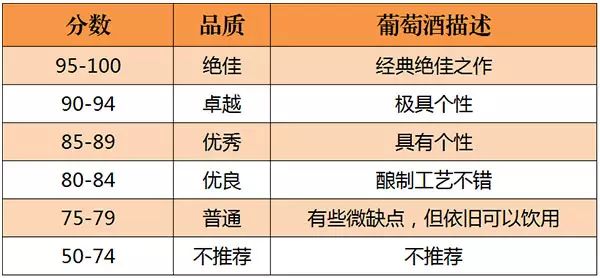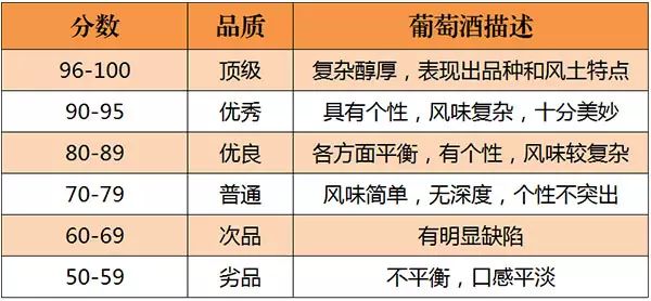 美國的《葡萄酒與烈酒》(Wine & Spirits)雜志是世界上最權(quán)威的葡萄酒雜志之一。自 1994年起,《葡萄酒與烈酒》也開始采取百分制對葡萄酒進行評分,葡萄酒首先會經(jīng)過一些葡萄酒專業(yè)人士進行初次品嘗篩選,之后才會送到專業(yè)“評酒團”品評,所以該雜志評分的葡萄酒品質(zhì)都不錯。評分標(biāo)準(zhǔn)如下所示: