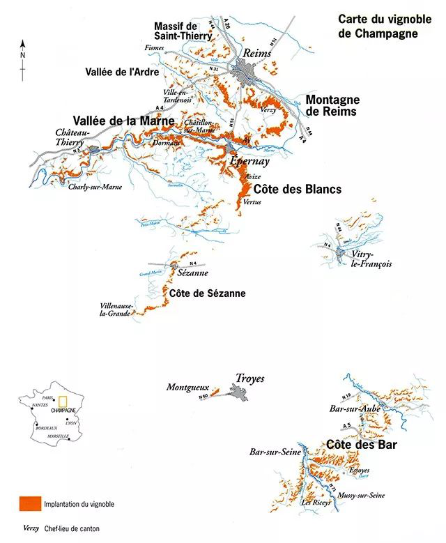 最著名的特級園有:Ambonnay,Aÿ,Avize,Bouzy,Chouilly,Cramant,Le Mesnil sur Oger,Oiry,Verzenay,Verzy。