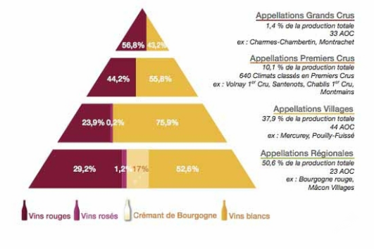 與波爾多完全不同的是,勃艮第并不是以酒莊為分級方法,而是以土地的位置為來進行,表現如金字塔般垂直走向的方式,以原產地為命名系統(AOC)建立形成,井然有序的分級制度一直保存至今。