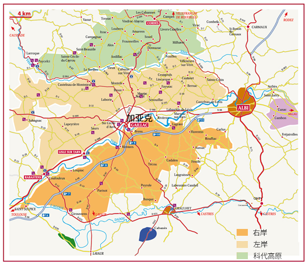加亞克的3大主要子產(chǎn)區(qū)分別為右岸(Rive Droite)、左岸(Rive Gauche)和科代高原(Plateau Cordais)。其中位于塔恩河(Tarn River)以南的右岸產(chǎn)區(qū)地勢高,可俯瞰整個(gè)塔恩河。該產(chǎn)區(qū)的葡萄園以黏土和石灰?guī)r土壤為主,出產(chǎn)著優(yōu)質(zhì)的莫札克和布洛可。其中由莫札克釀成的酒既有優(yōu)雅柔順且回味悠長的干型白葡萄酒,又有芳香馥郁的甜酒,而布洛可紅葡萄酒則充滿水果和香料風(fēng)味。塔恩河以北的左岸產(chǎn)區(qū)地勢較低,以鵝卵石、砂土和礫石為主,有著孕育優(yōu)質(zhì)紅葡萄酒的杰出風(fēng)土。這里出產(chǎn)的杜拉斯紅葡萄酒風(fēng)格強(qiáng)勁有力、單寧圓潤,而白葡萄酒雖不比右岸的脆爽,但采用蘭德樂釀成的白葡萄酒卻有著出色的復(fù)雜度。此外,該產(chǎn)區(qū)還出產(chǎn)著品質(zhì)優(yōu)異的遲摘(Late Harvest)葡萄酒。位于加亞克北部的科代高原以石灰?guī)r為主,其出產(chǎn)的白葡萄酒擁有清新的花香和果香,紅葡萄酒口感平衡、適宜陳年,桃紅葡萄酒果味芳香、酒體輕盈。