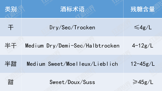 人們根據(jù)殘?zhí)呛繉⑵咸丫品譃榱税ǜ尚驮趦?nèi)的幾個(gè)類別,具體可參照下表。需要注意的是,“干型”葡萄酒并不是完全不含糖,只是含糖量較低,無法被人所感知而已。