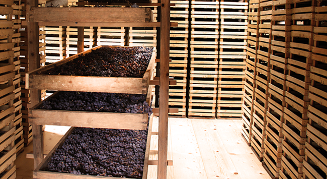 常見的風(fēng)干工藝之一是將果實(shí)留在葡萄藤上進(jìn)行自然風(fēng)干,待葡萄在藤上變干、糖分得到高度濃縮之后再采收,用于釀造甜酒。此種工藝對(duì)天氣條件有特定的要求,葡萄必須在溫暖干燥的秋季才能風(fēng)干,否則會(huì)容易感染灰霉菌。在法國(guó)蘇玳(Sauternes)產(chǎn)區(qū),倘若葡萄沒有成功感染貴腐菌,一些酒莊便會(huì)采用此方法幫助葡萄濃縮糖分,釀造出風(fēng)味濃郁、口感美妙的甜酒。用這種方式釀造出的葡萄酒有時(shí)會(huì)在酒標(biāo)上標(biāo)注“晚采收(Late Harvest)”。另外,也可將采摘后的葡萄鋪在草席上于室外曬干,又或者把葡萄放置于干燥通風(fēng)的屋子中風(fēng)干〔此風(fēng)干工藝在意大利瓦坡里切拉(Valpolicella)產(chǎn)區(qū)廣泛使用,在當(dāng)?shù)乇环Q作“枯藤法”(Appassimento)〕。風(fēng)干后的葡萄流失了大量水分,果實(shí)中的糖分和風(fēng)味物質(zhì)得以濃縮,因此釀成的葡萄酒擁有飽滿的酒體和較高的酒精度,風(fēng)味也十分濃郁。