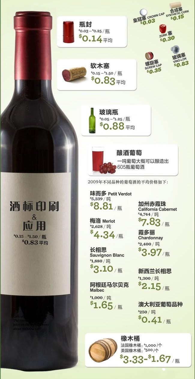 一般來說,性價比高的葡萄酒是指其價格絕大部分來源于生產成本的葡萄酒。葡萄酒的生產成本包括哪些呢?下面的圖片詳細地介紹了一瓶葡萄酒的各個部分分別需要多少成本。