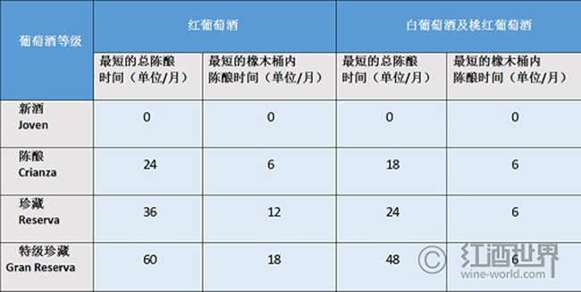 需要注意的是,該表標注的只是西班牙規定的最短陳釀時間,而有些子產區,如里奧哈(Rioja)和杜埃羅河岸(Ribera del Duero)等,對總陳釀時間及(或)橡木桶內陳釀時間的要求一般更高。