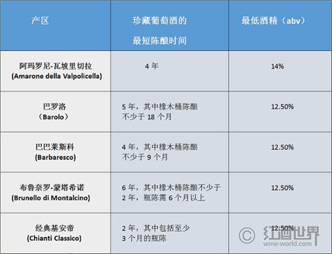 意大利用“Riserva”來表示珍藏,并對該詞的使用作出了嚴格規定。但不同于西班牙,意大利的規定并不統一,而是依各個產區的法規而定:“珍藏”葡萄酒的酒精度和陳釀時間均需要超過其所在產區的法定最低標準。因此,在意大利不同的產區,“珍藏”葡萄酒需要滿足的標準大有不同,具體可見下表: