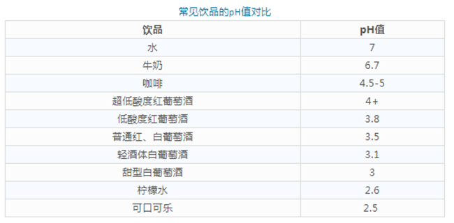 首先,所有類型的葡萄酒無一例外都是“酸性”的,絕大多數葡萄酒的pH值都介于3~4之間(理想情況下,白葡萄酒的pH值在3.0~3.4之間,而紅葡萄酒在3.3~3.6之間),低于咖啡,但比檸檬水稍高。
