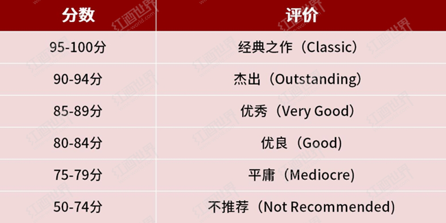 為了提升雜志的內(nèi)容質(zhì)量,WS在給新發(fā)布的酒款做品評的同時,也在不斷改進(jìn)自己的評價機制。從修正版加州大學(xué)戴維斯分校九分制(Modified UC Davis Nine-point Scale)到歐洲二十分制,再到挑選出“觀者之選(Spectator Selections)”、“高性價比(Best Buys)”和“不推薦(Not Recommended)”酒款,WS對葡萄酒的評價機制幾經(jīng)變換。1985年,WS決定采用百分制來評價葡萄酒并沿用至今。百分制以50分為起評分,將酒款劃分為六個等級: