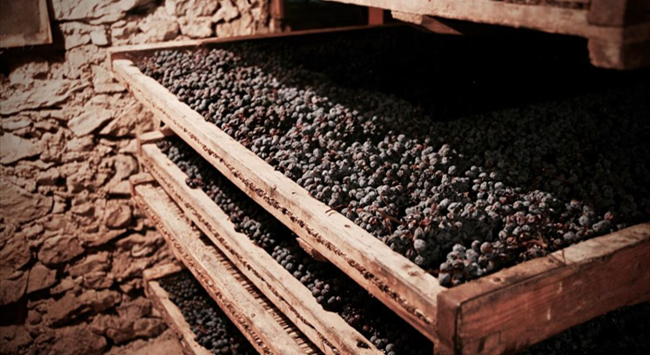 阿瑪羅尼葡萄酒獨(dú)樹一幟的風(fēng)格,離不開其令人津津樂(lè)道的釀造方法——帕賽托法(Passito Method)。帕賽托法指的是用風(fēng)干的葡萄釀造葡萄酒的工藝,因而又稱枯藤法(Appassimento)。每年葡萄成熟季時(shí),酒莊的工作人員會(huì)提前采收葡萄,這時(shí)葡萄的酸度還很高,采收后并不急著將它們送去釀酒,而是將葡萄放在通風(fēng)良好的室內(nèi)風(fēng)干幾個(gè)月,使果實(shí)流失部分水分,糖分和風(fēng)味物質(zhì)得以集中。這種方法可以為成酒增添風(fēng)味、酒體和酒精度。