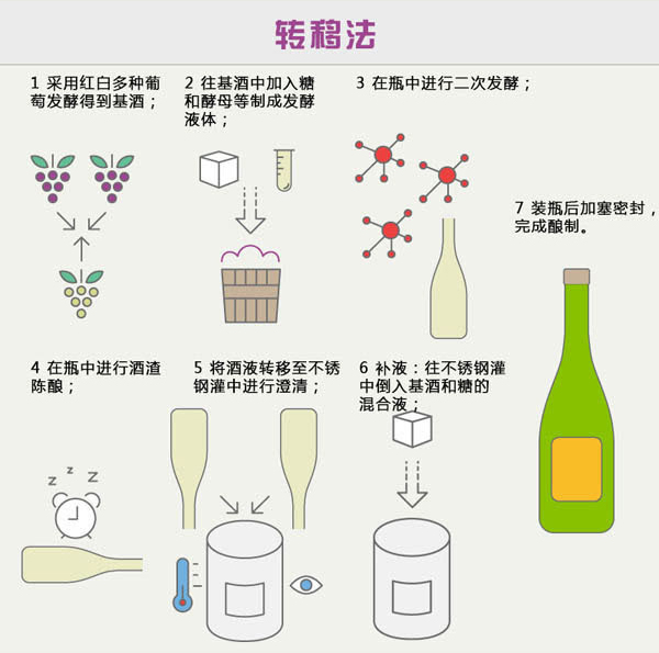 轉移法和傳統釀造法在初期階段極為相似,不過前者在瓶中發酵完成后,會轉移至不銹鋼灌中進行澄清,完成剩余步驟,然后再重新裝瓶。