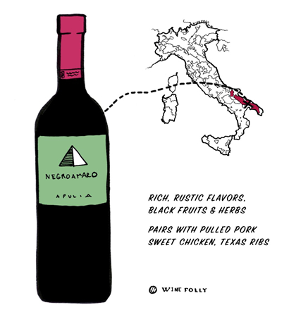 其實,在意大利語中,“Negro”意為“黑色”,“Amaro”則意為“苦味”,可以想象,它的果皮顏色深邃且含有豐富的單寧。因此,重酒體的黑曼羅也經(jīng)常會與普里米蒂沃(Primitivo)進行混釀,來降低單寧的厚重感,并增加諸如紅色水果的甜美香氣。