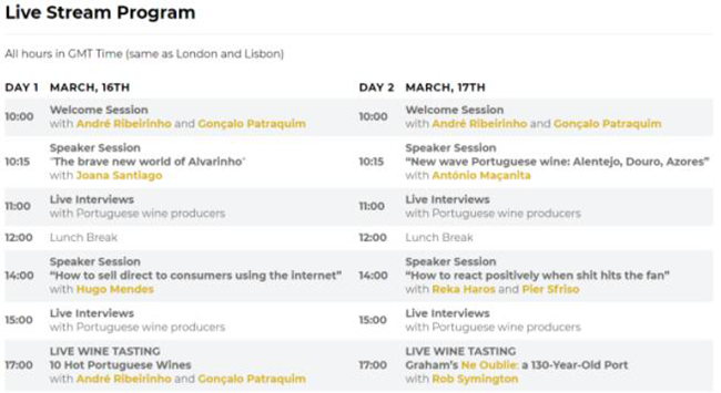 在2020 Prowein宣布取消之后,消費葡萄酒活動開始轉(zhuǎn)入線上直播。葡萄牙葡萄酒周設(shè)置兩部分,其中包括一對一的B2B會議以及包括訪談、嘉賓演講者等的實時直播。