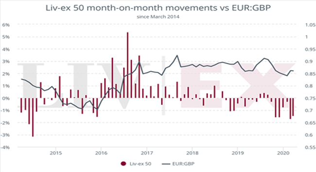 在整個2017年度,Liv-ex 50(見下文)對歐元兌英鎊匯率非常敏感;隨歐元的升跌而變化。 在2018年度,價格因匯率穩定也變得相對平穩。在2019年夏季,英鎊由于Theresa May被迫辭職而疲軟,美元和歐元買家再次把握入市。然而,在英國大選前夕及美國對歐洲葡萄酒征收關稅等因素的影響下,英鎊快速走強,令市場(Liv-ex 50)在最后一個季度走軟。