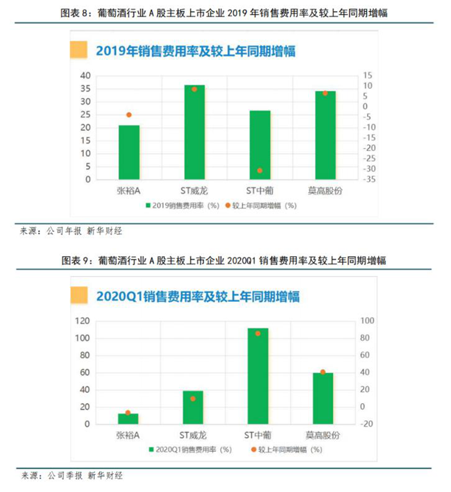 2020年第一季度,張裕銷售費用率顯著下降,為四家上市企業中最低,主要由于新冠肺炎疫情嚴重影響公司營銷活動減少。不僅僅是張裕,其他三家銷售費用均受疫情影響大幅下滑,所以其他三家高企的銷售費用率及增幅,并不是品牌和渠道建設上的大手筆投入增加,而是銷售費用的下滑幅度并沒有追上其營收的下滑幅度所致。