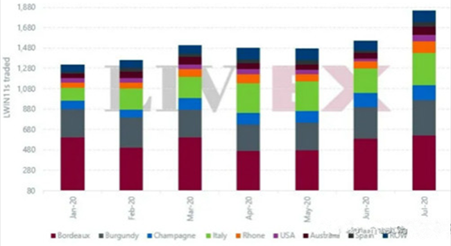 勃艮第保持在每月約20%的LWIN交易,總體市場穩(wěn)定增長。