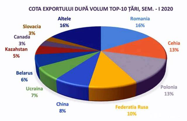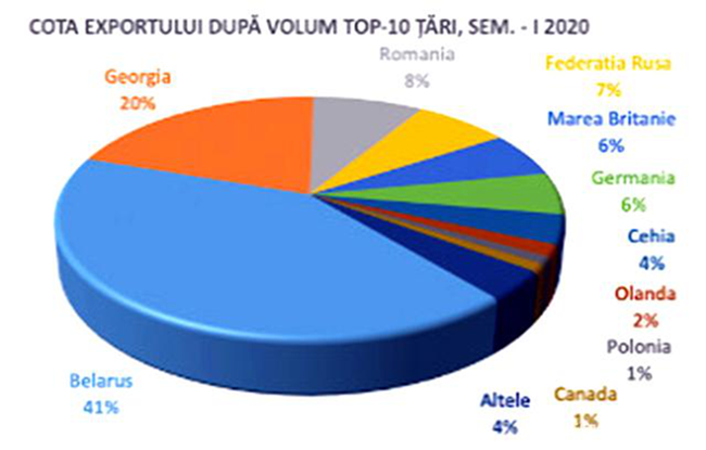 2020年前6個月,摩爾多瓦葡萄酒出口到全世界56個國家和地區,其中羅馬尼亞、烏克蘭和捷克共和國的需求增加,而俄羅斯聯邦和白俄羅斯的需求減少,這種波動與新冠全球大流行局勢和實物進出口暫時停止有關。