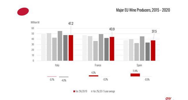 北半球2020年的采收并未受到因疫情封鎖措施的強(qiáng)烈影響。2020年,歐盟國(guó)家葡萄酒產(chǎn)量為159億升(mhl),占全球總產(chǎn)量的62%。