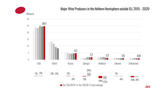 在歐盟以外的北半球,俄羅斯(4.7 mhl, +2%/2019)和烏克蘭(1.0 mhl, +1%/2019)等國(guó)家的2020年葡萄酒產(chǎn)量較高,而格魯吉亞和摩爾多瓦(經(jīng)歷干旱)的產(chǎn)量分別下降了1.7 mhl(-3%/2019)和1.2 mhl(-18%/2019)。