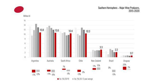 2020年,南半球的產(chǎn)量為49 億升(mhl),為過(guò)去15年的最低水平,仍占全球葡萄酒產(chǎn)量的21%。