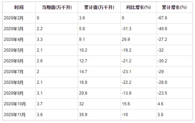 2020年11月全國葡萄酒產量為3.6萬千升,累計值為35.9萬千升,同比下降10%,累計增長3.8%。