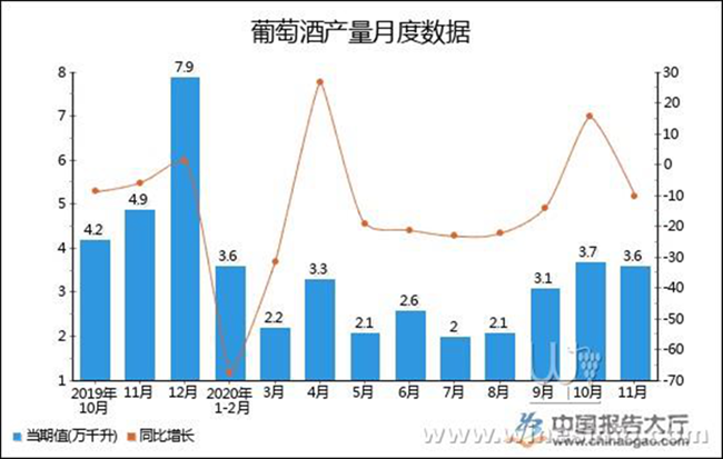 根據中國報告大廳對2020年1-11月全國葡萄酒產量進行監測統計顯示:2020年11月全國葡萄酒產量3.6萬千升,同比下降10%,2020年1-11月全國葡萄酒產量為35.9萬千升,累計增長3.8%。