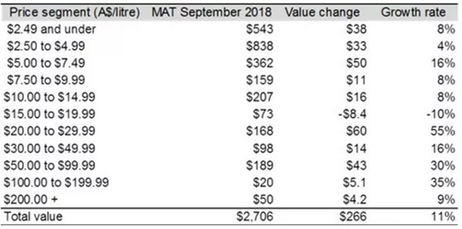 “在截止到9月30日的一年內,各個價格區間內都有良好增長。10澳元/升及以上的葡萄酒出口額增長了20%至8.04億澳元,而20到29.99澳元之間的葡萄酒增長尤其迅猛。10澳元/升以下的葡萄酒當中,5到7.49澳元區間增速明顯,增長了5000萬澳元。”
