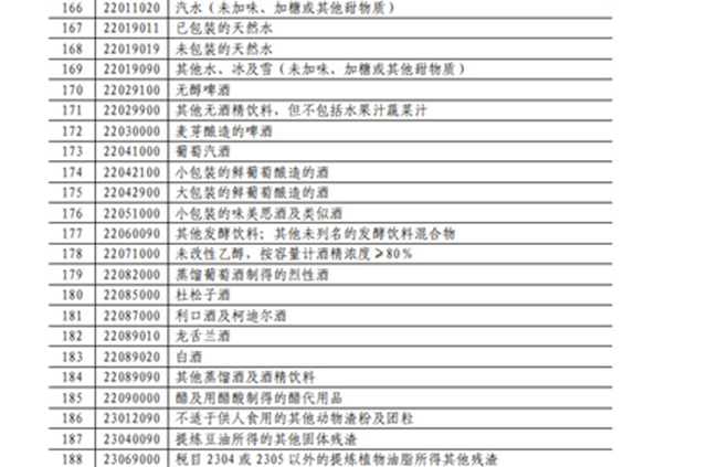 葡萄酒位于《對(duì)美實(shí)施加征25%關(guān)稅商品清單》中,“葡萄汽酒”、“小包裝的鮮葡萄釀造的酒”、“大包裝的鮮葡萄釀造的酒”、“小包裝的味美思酒及類似酒”4個(gè)類目均在列。此外,各種烈性酒、啤酒的類目也在這份清單中。