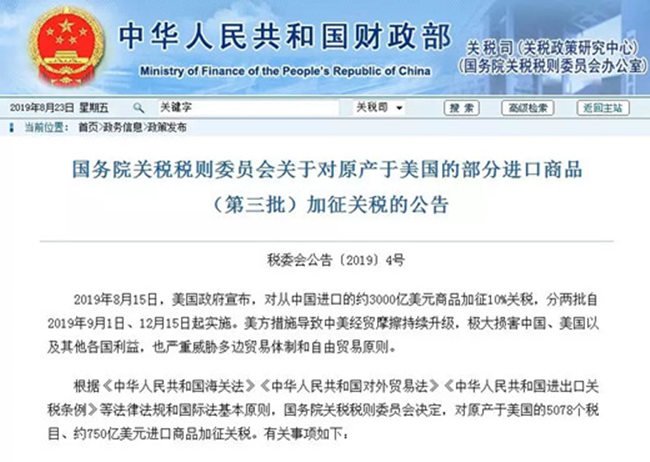 公告顯示:2019年8月15日,美國政府宣布,對從中國進口的約3000億美元商品加征10%關稅,分兩批自2019年9月1日、12月15日起實施。美方措施導致中美經貿摩擦持續(xù)升級,極大損害中國、美國以及其他各國利益,也嚴重威脅多邊貿易體制和自由貿易原則。