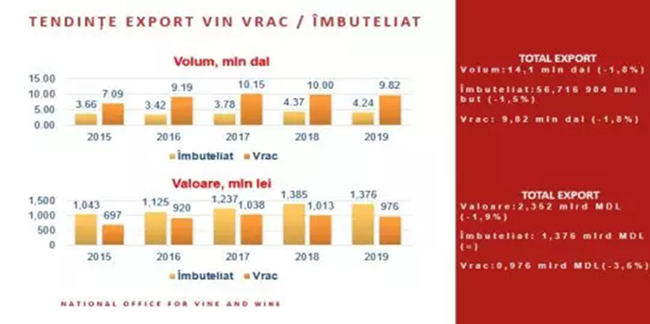 在2018-2019葡萄酒年度,摩爾多瓦共和國葡萄酒出口總量為14.1萬千升(-1.8%),其中包含4.24萬千升(56716.904瓶)瓶裝葡萄酒(-1.5%)以及9.82萬千升(-1.8%)散裝葡萄酒。