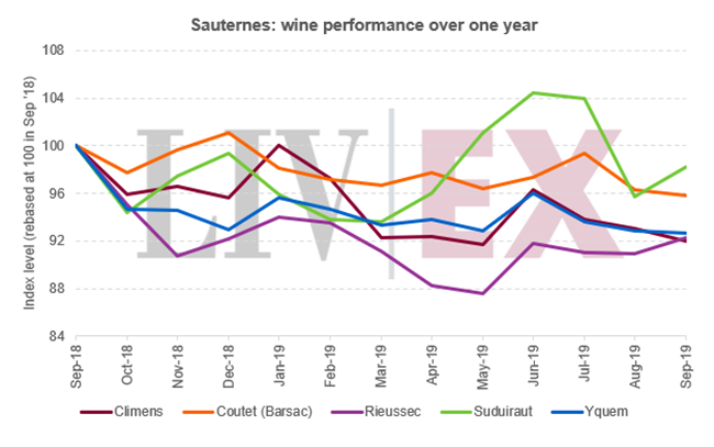 在過去的一年,蘇玳50中的成份葡萄酒無一漲價(jià)。如下圖所示,克里蒙Climens跌幅最大(-8.0%),而旭金堡Suduiraut跌幅最小(-1.8%);而最近發(fā)布的伊甘Yquem 2017年也跌價(jià)7.3%。
