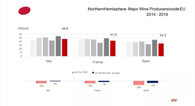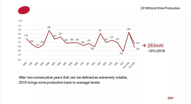 據(jù)國際葡萄與葡萄酒組織(OIV)最新數(shù)據(jù)顯示,2019年全球葡萄酒產(chǎn)量為263億升(mhl),同比2018年下降了10.54%。包括法國、意大利、西班牙在內的葡萄酒主產(chǎn)國產(chǎn)量均有不同程度下降。OIV的數(shù)據(jù)來自28個國家,占全球葡萄酒產(chǎn)量的85%。