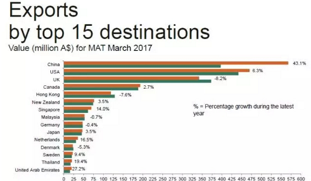 澳大利亞葡萄酒 管理局(Wine Australia)于2017年4月發布最新出口報告。報告顯示,在過去一年里,澳大利亞葡萄酒對中國大陸出口持續走強,價量齊升!中國大陸依然保持澳大利亞葡萄酒出口額第一大市場的重要地位。 截止到2017年3月底的一年內,澳大利亞對中國大...