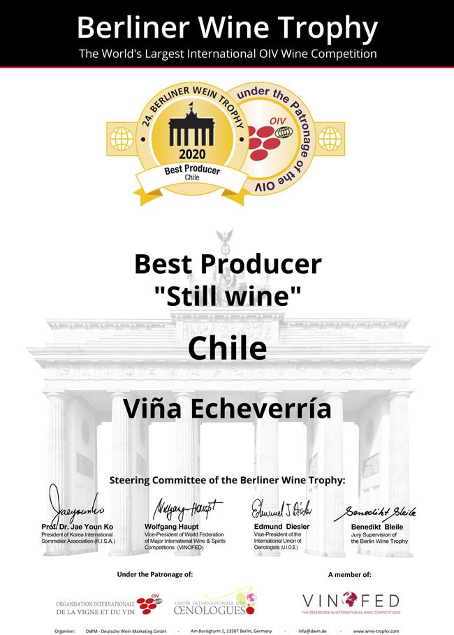 與此同時(shí),智利-安智利雅家族酒莊(Echeverria Family Wines)更是在此項(xiàng)賽事中榮獲了“2020柏林葡萄酒大獎(jiǎng)賽-智利最佳生產(chǎn)商”的稱號(hào)!其實(shí)一切的榮譽(yù)都離不開安智利雅家族酒莊自身扎實(shí)的發(fā)展戰(zhàn)略,自1700年起,安智利雅家族在智利農(nóng)業(yè)領(lǐng)域始終業(yè)績出眾,20 世紀(jì)初便開始從事葡萄栽植及釀酒行業(yè)。安智利雅家族酒莊更是擁有一個(gè)堅(jiān)不可摧的工作團(tuán)隊(duì),具有悠久的釀酒傳統(tǒng)與經(jīng)驗(yàn),且與環(huán)境和諧共存!其強(qiáng)大的凝聚力來自深邃的家族根基、對(duì)釀酒藝術(shù)的共同激情、對(duì)完美的不懈追求以及為達(dá)到客戶滿意而作出的全身心的投入!