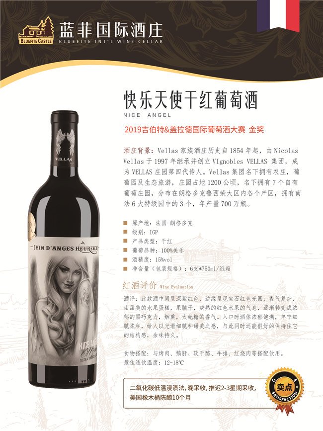 快樂(lè)天使干紅葡萄酒以100%美樂(lè),采用二氧化碳低溫浸漬法釀造,而后經(jīng)過(guò)美國(guó)橡木桶陳釀10個(gè)月,酒體中間呈深紫紅色,邊緣呈現(xiàn)寶石紅色光圈;擁有香氣復(fù)雜,由甜美的水果蛋糕,果脯干,成熟的紅色水果的氣息,逐漸轉(zhuǎn)變成濃郁的黑巧克力,煙熏,太妃糖的香氣,入口時(shí)酒體濃郁飽滿,單寧細(xì)膩柔和,給人以光滑細(xì)膩和甜美之感,與此同時(shí)還能很好的保持住它的結(jié)構(gòu)感,余味持久。