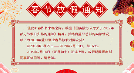 尊敬的藍菲代理商、經銷商們: 值此新春即將來臨之際,藍菲酒業(yè)全體員工提前祝大家:新春快樂,闔家幸福。 自2019年1月29日2019年2月13日,共16天,為 藍菲酒業(yè) 春節(jié)假期,于2019年2月14日(正月初十)正式上班,放假期間公司安排人員正常值班,請悉知。 新春...